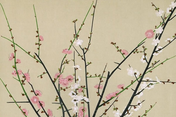 Red and White Plum Blossoms, woodcut by Shoko UEMURARed and White Plum Blossoms